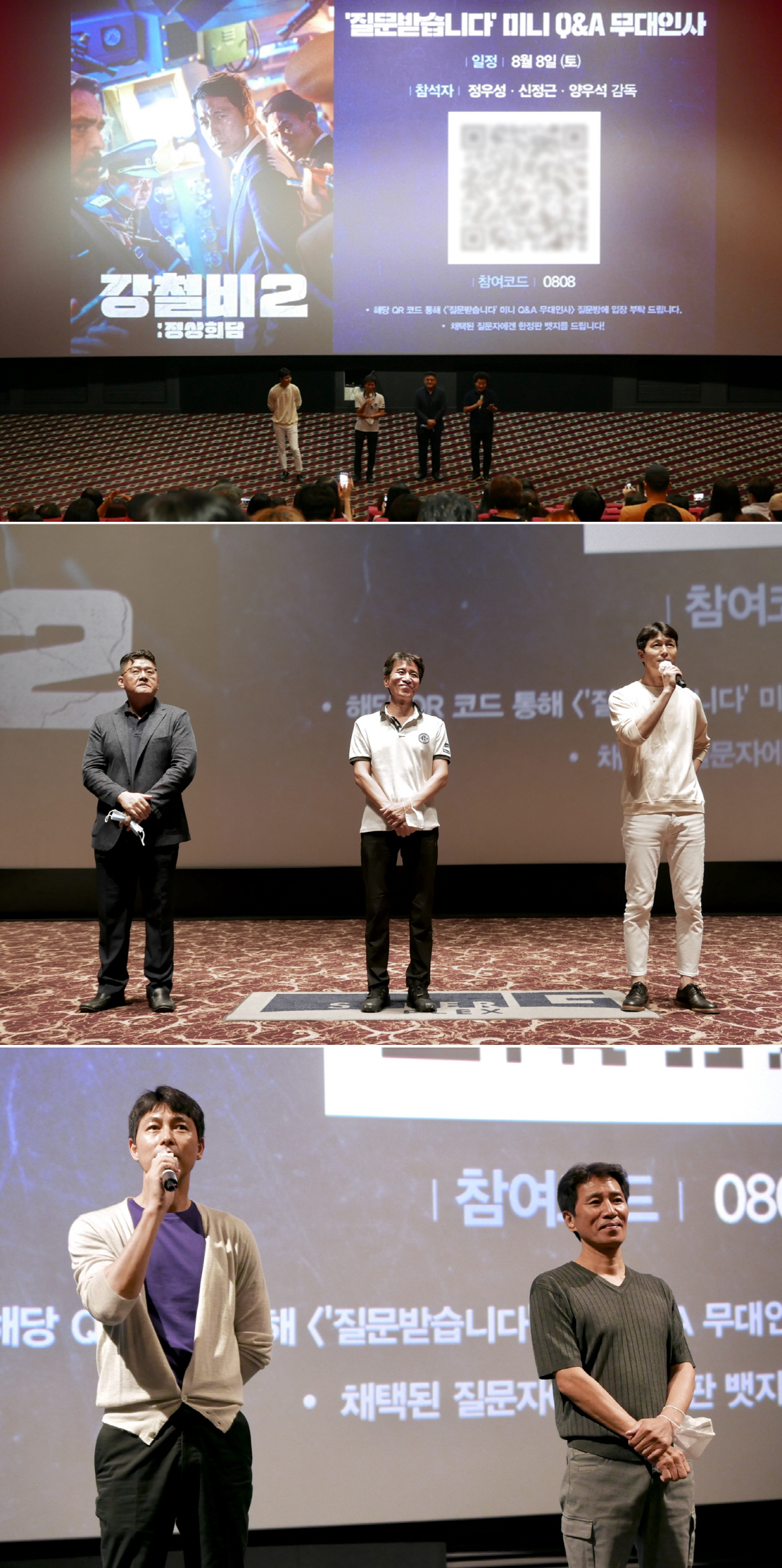 대한민국 대통령 역의 정우성은 "귀한 시간을 '강철비2'와 함께 해 주셔서 감사드린다. 어렵고 무거워 보일 수 있지만 쉽고 재미있게 보실 수 있다. 주변에 입소문 많이 부탁드린다"며 당부의 말을 덧붙였다. 북한 최초 핵잠수함 백두호의 부함장 역의 신정근은 "채워진 객석을 보니 뭉클하다. '강철비2' 응원 많이 부탁드리며, 비 피해 없도록 주의하시고 건강 조심하시길 바란다"며 극장을 찾아준 관객들에게 진심 어린 감사 인사를 전했다.