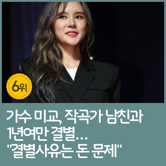 6위 : 가수 미교, 작곡가 남친과 1년여만 결별…"결별사유는 돈 문제"