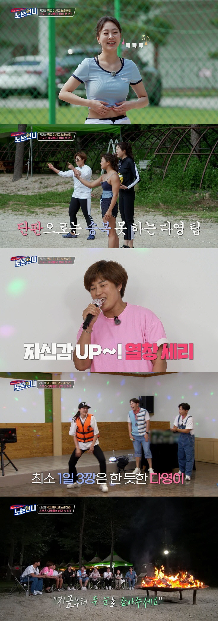 11일 방송한 E채널 '노는 언니'에서 언니들은 물놀이에 이어 족구, 바비큐 파티, 장기자랑, 캠프파이어까지 MT에서 즐길 수 있는 모든 놀 거리를 섭렵하고 뜨거운 하루를 완성했다.
