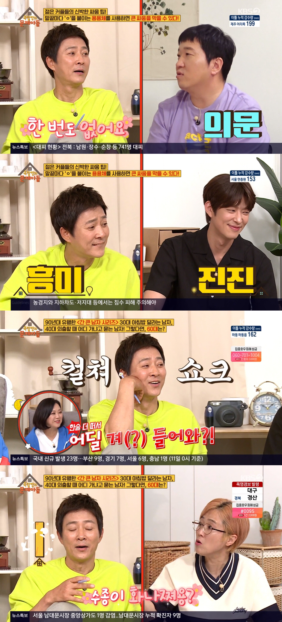 정답은 '말 끝마다 ㅇ을 붙이는 용용체'를 사용하는 것. 최수종은 노트에 적으며 "'희라씨 나 오늘 잘했어요'이라고 한 번 해봐야지"라고 즐거워했다. 정형돈은 "여보 이제 그만해요라고 하지 않냐"고 물었고, 최수종은 "한 번도 그런 적 없다"라며 흐뭇하게 웃었다.
