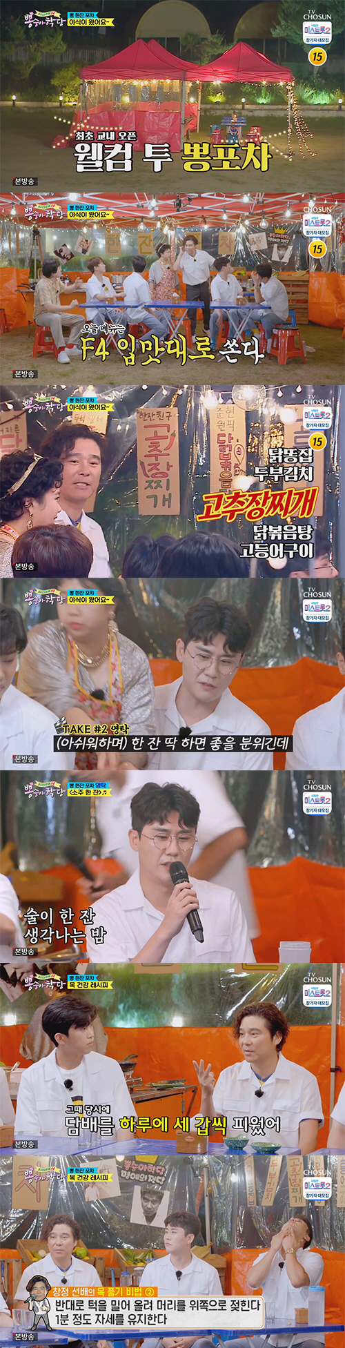 임창정은 자취생 시절 추억의 음식인 '고추장찌개'를 자신만의 레시피로 직접 요리해 트롯맨 F4에게 건냈다. 영탁은 낭만적인 포차 분위기에 취한 채 임창정의 최고 명곡인 '소주 한잔'을 열창, 진한 감성을 더했다. 이찬원 역시 트로트를 부를 때와는 또 다른 창법으로 '날 닮은 너'를 선보여 임창정을 흐뭇하게 만들었다.