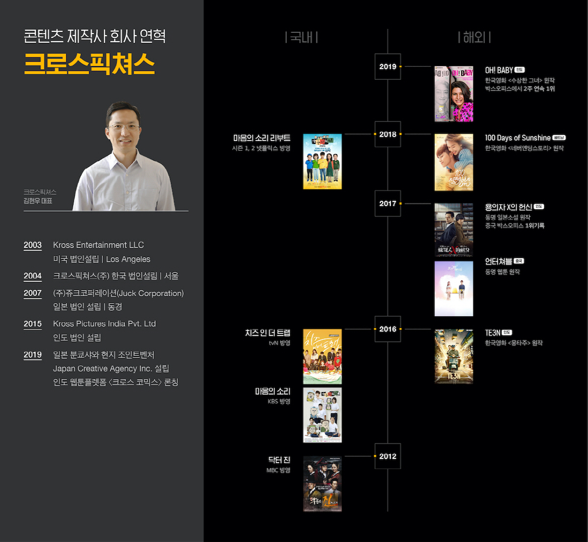 '크로스픽쳐스'는 일찌감치 인도 콘텐츠 시장의 가능성을 내다보고 국내 제작사 중 유일하게 인도시장에서 성공사례를 만들었다. 14억 인구, 20여개의 공용 언어, 10개 이상의 문화권역으로 나뉘어져 있는 인도는 해외진출에서 난이도가 높은 시장이다. 일년에 약 2천 편의 영화가 쏟아져 나오지만 만화 시장은 전무할 정도로 문화적 쏠림 현상도 큰 편. 이러한 인도 콘텐츠 시장을 꿰뚫은 크로스픽쳐스는 인도 최초로 웹툰 플랫폼인 '크로스코믹스'를 론칭시켜 성장 중에 있다.