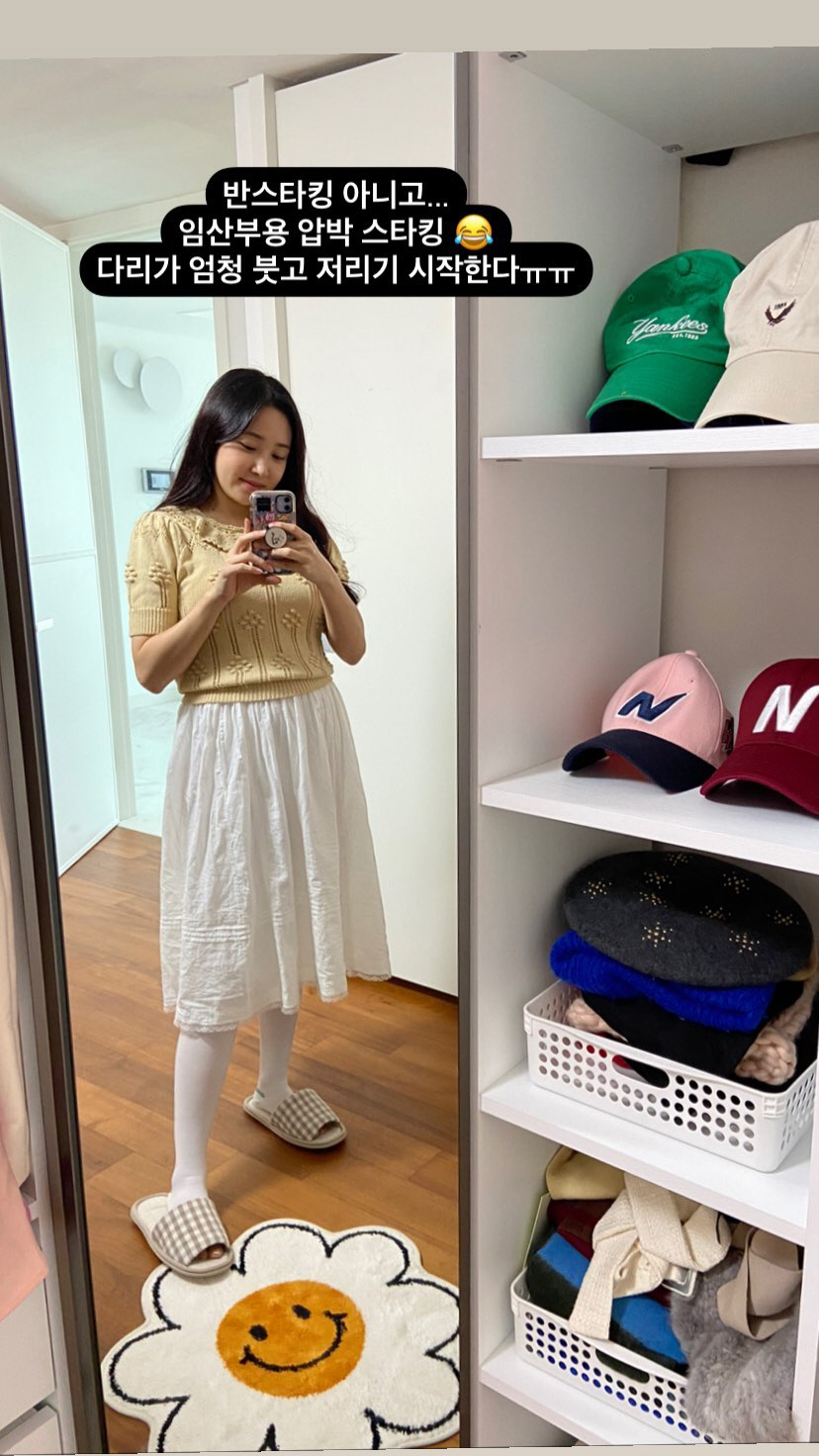 최희는 17일 자신의 인스타그램 스토리를 통해 "반스타킹 아니고..임산부용 압박 스타킹. 다리가 엄청 붓고 저리기 시작한다"는 글과 함께 한 장의 사진을 게재했다. 공개된 사진 속에는 압박스타킹을 신은 채 거울 셀카를 찍고 있는 최희의 모습이 담겼다. 임신 6개월 차에 접어든 최희의 현실 고충이 관심을 모은다.