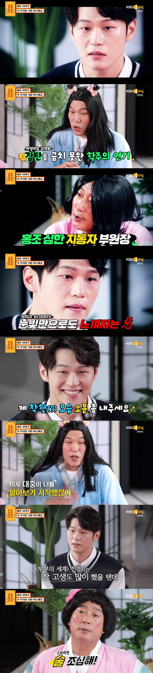 이후 이학주는 평소 쉽게 볼 수 없었던 '순한 맛' 캐릭터로 분해 열연까지 펼쳤다. 그러나 이를 본 서장훈은 "그래도 아직 무섭다. 악역 연기가 너무 강했던 것 같다"고 말해 웃음을 안겼다. 이어 서장훈은 "악역 이미지가 걱정이면, 앞으로 착한 역할도 맡아봐라. 밝은 장르의 드라마에서 사랑스러운 배역을 맡았는데, 그 드라마가 대박이 난다면 무서운 이미지가 사라질 것이다"고 알려줬다.
