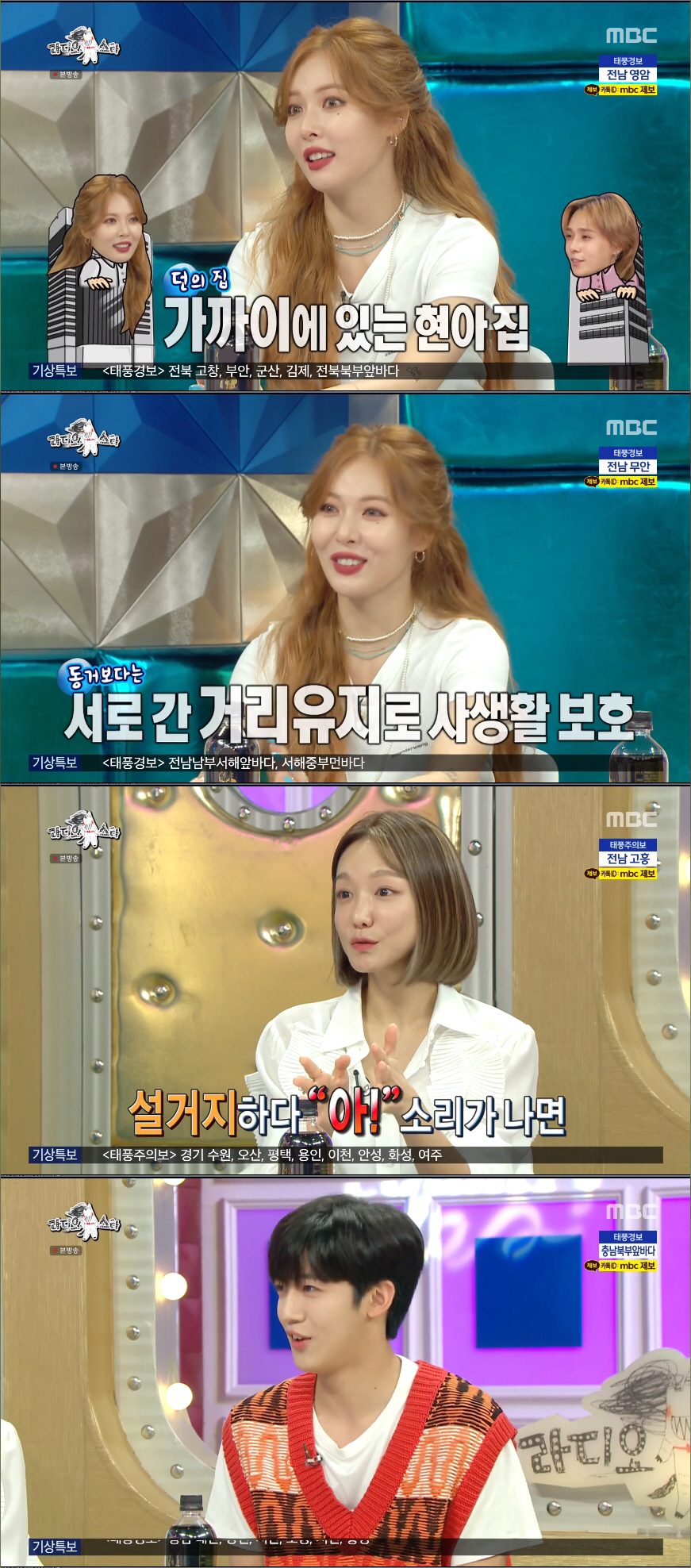 현아는 '김구라보다 삶의 질이 더 높다'는 질문에 "저는 요즘 행복하다. 집을 연인 던과 가까이에 얻었다. 가까이 지내는 것만으로도 좋더라"라며 "걸어서 3분 정도 된다. 그 느낌이 좋다"라고 밝혔다.