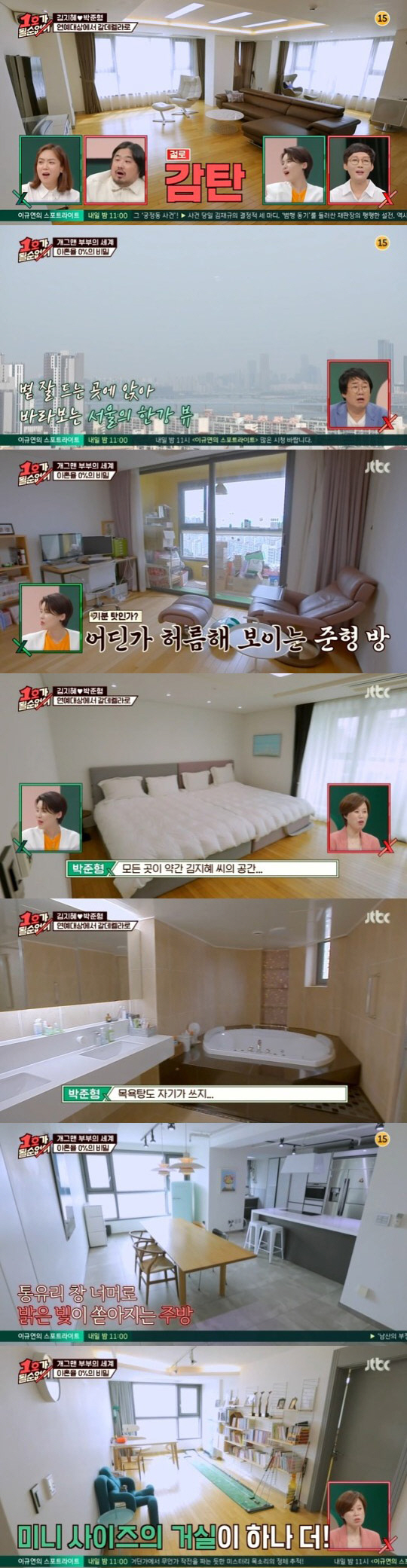 채광이 좋은 집 내부에는 무채색 톤의 깔끔한 인테리어로 꾸며져 있었다. 트렌디한 감성이 돋보이는 공간을 지나면 김지혜가 주로 쓰는 미니 사이즈 거실이 있었고, 그 옆에 작은 문을 열고 들어가면 박준형이 개인적으로 사용하는 방이 있었다. 부부의 집은 화장실이 4개가 존재하는 90평대 아파트다.