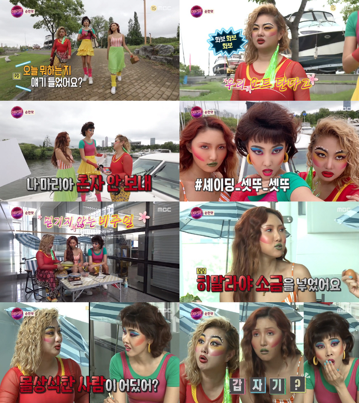 이날 방송에서는 '여은파'의 첫 번째 프로젝트 '홈트 프로젝트'의 포스터 촬영 현장이 공개됐다. 요트 선착장에 도착한 세 사람은 형형색색의 메이크업과 의상으로 시선을 사로잡았다. 그 누구보다 화려한 분장을 한 박나래(조지나)는 주변에 사람이 없는 것에 대해 아쉬워하며 남다른 자신감을 드러내기도. 뿐만 아니라 더 진한 화사(마리아)의 셰이딩을 보고 볼을 더 칠한 뒤 "나 화사(마리아) 혼자 안 보내. 같이 가"라며 의리를 뽐내 웃음을 안겼다.