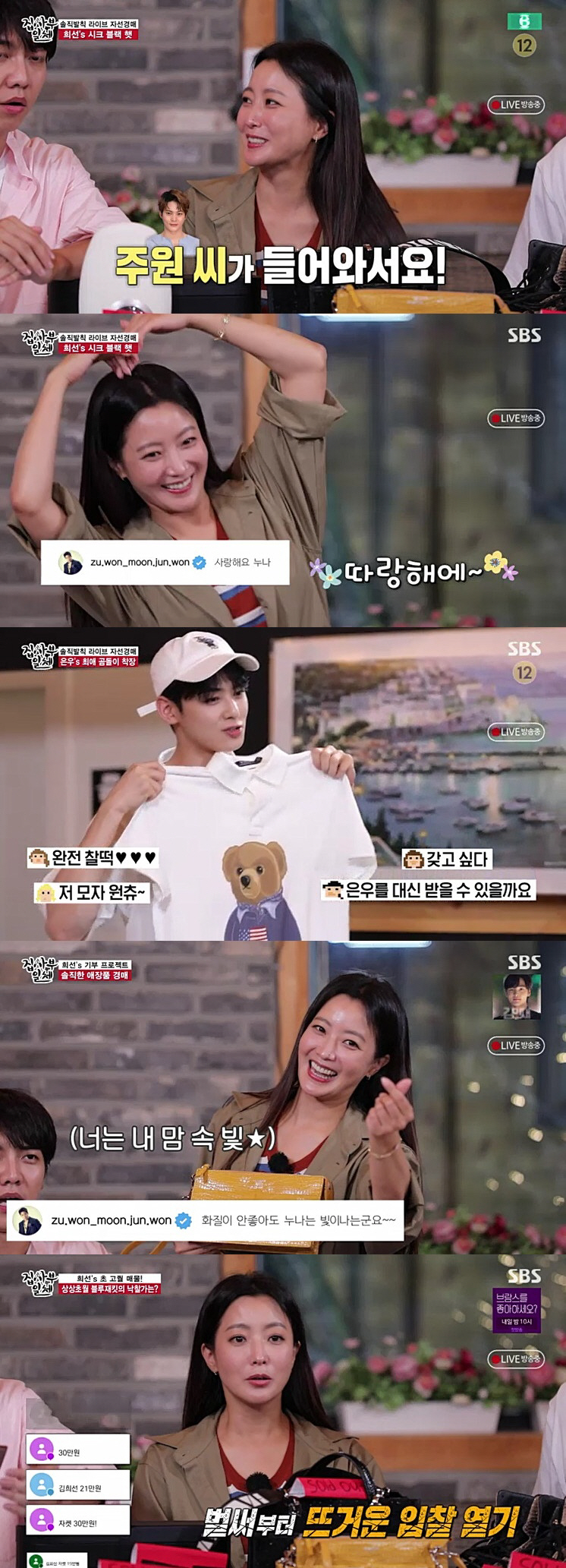 김희선은 적극적으로 첫 애장품을 홍보했다. 김희선의 남편도 댓글로 참여를 독려했다. 첫 물품부터 문자가 쏟아졌다. 시작 30초 만에 20만 원을 돌파한 모자는 45만 원에 낙찰됐다.