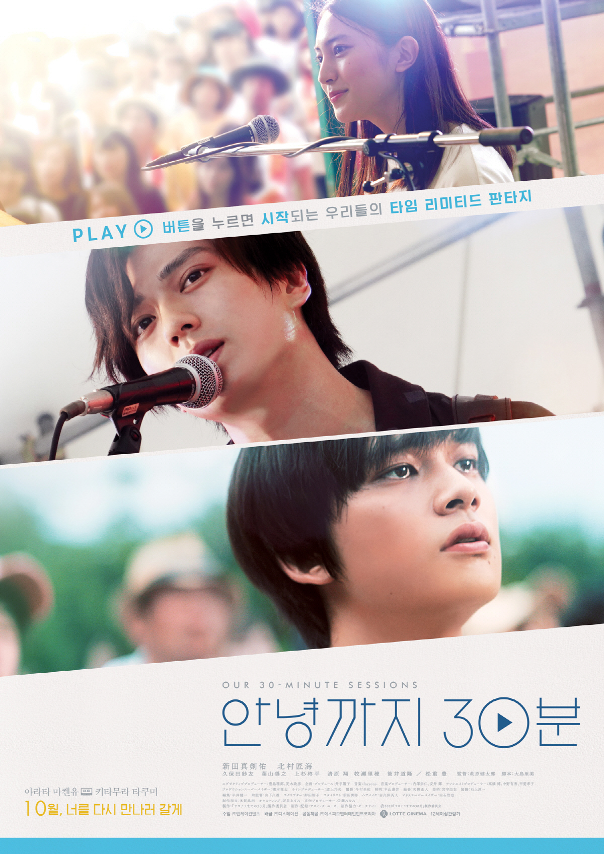 '안녕까지 30분'은 카세트테이프가 재생되는 30분 동안 이 세상에서 사라진 소년이 우연한 기회로 다른 소년의 몸을 빌려 모두를 다시 만나러 가는 이야기를 그린 타임 리미티드 판타지 영화다. 아라타 마켄유, 키타무라 타쿠미, 쿠보타 사유, 하야마 쇼노, 키요하라 쇼우 등이 출연하고 '도쿄 구울'의 하기와라 켄타로 감독이 메가폰을 잡았다. 오는 9월 9일 롯데시네마에서 단독 개봉 예정이었지만 코로나19 확산으로 오는 10월 개봉을 연기했다.
