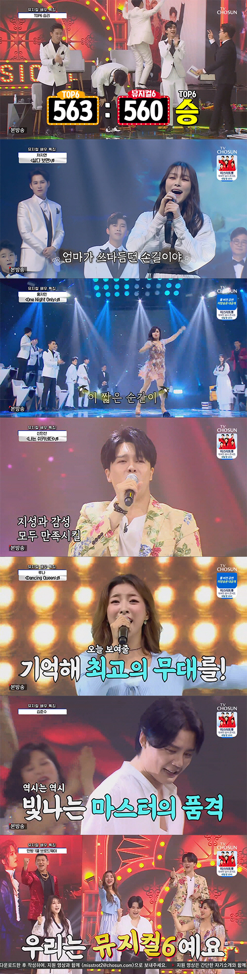 [스포츠조선닷컴 김준석 기자] TOP6가 뮤지컬6와 대결에서 총점 1점차로 승리했다.