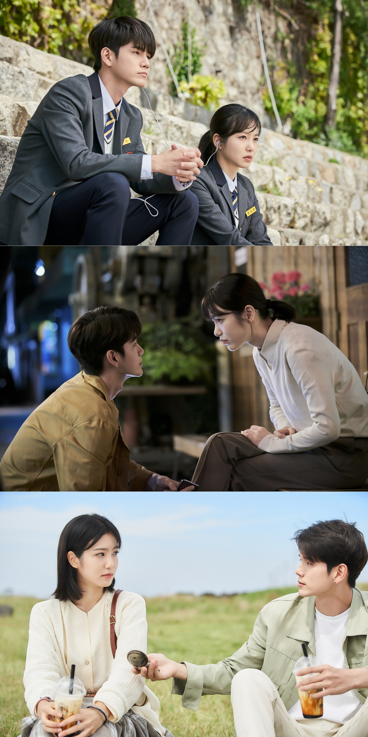 이날 공개된 사진에는 서로에게 특별한 친구인 이수와 경우연의 오랜 시간이 담겨있다. 먼저 빈 교정에 나란히 앉아있는 고등학생 이수, 경우연의 모습이 눈길을 끈다. 이어폰을 나눠 낀 두 사람은 말하지 않아도 서로의 마음을 아는 듯하다. 말없이 자신의 이어폰 한쪽을 내어준 이수와 생각에 잠긴 경우연에게 어떤 일이 일어났는지 궁금해진다. 늘 서로의 주변에 있었던 '절친'의 거리는 시간이 흐르면서 한 발짝 더 가까워진다. 벤치에 앉은 경우연과 그를 올려다보는 이수의 눈맞춤은 '심쿵'을 유발한다. 자신의 마음을 전하듯 이수를 깊게 바라보는 경우연과 다정한 이수 사이엔 설렘이 감돈다. 이어진 사진에서도 두 사람은 여전히 함께다. 이수가 경우연에게 건넨 나침반엔 어떤 의미가 담겨있을지, 한결같으면서도 미묘하게 달라져 가는 두 사람의 시간이 새로운 설렘 역사를 예고한다.