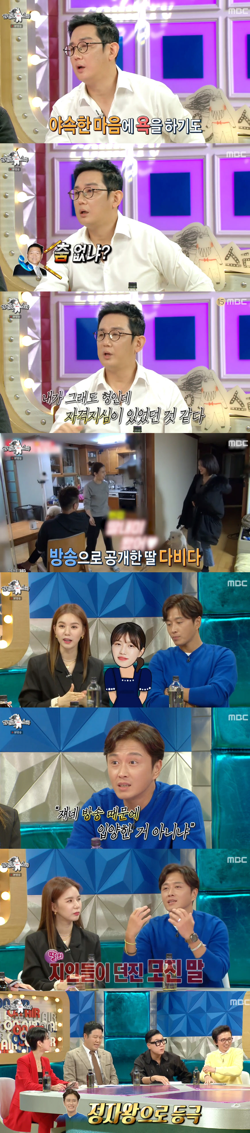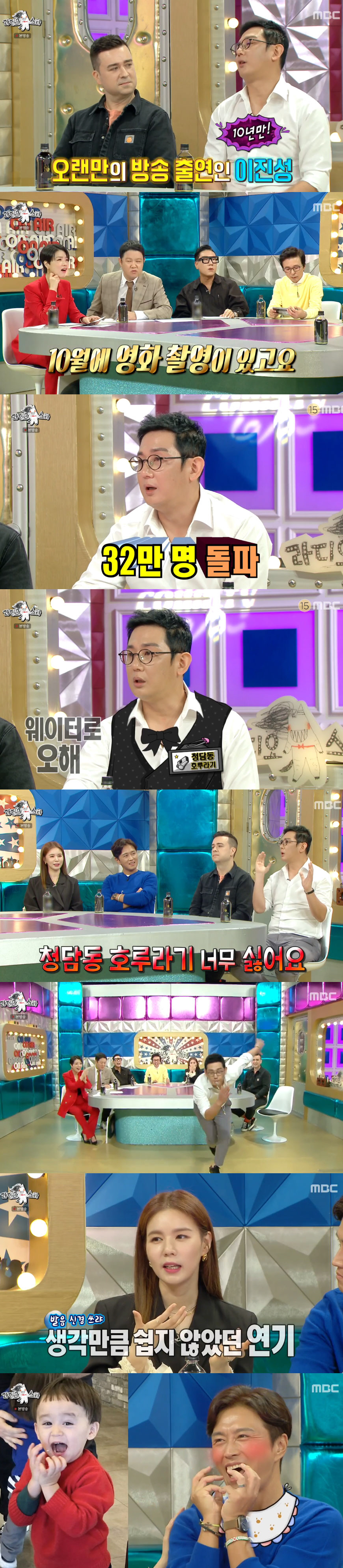 '청담동 호루라기' 이진성은 무려 10년 만에 방송에 출연했다. 그는 "10월에 영화 촬영이 있다. 인사 드릴 겸 나왔다"고 인사를 건넸다. '청담동 호루라기' 시절 팬클럽 수에 대해 그는 "초창기에 방송을 타고 32만명을 넘었다"면서 "호루라기라는 이미지를 사람들이 나이트 영업 이사 등으로 생각하더라. 그런 이야기를 들었을 때 나도 욱하더라"고 했다. 이진성은 "진짜 없애고 싶었다. '청담동 호루라기'가 너무 싫었다"면서도 호루라기를 장착한 채 댄스를 춰 웃음을 안겼다.