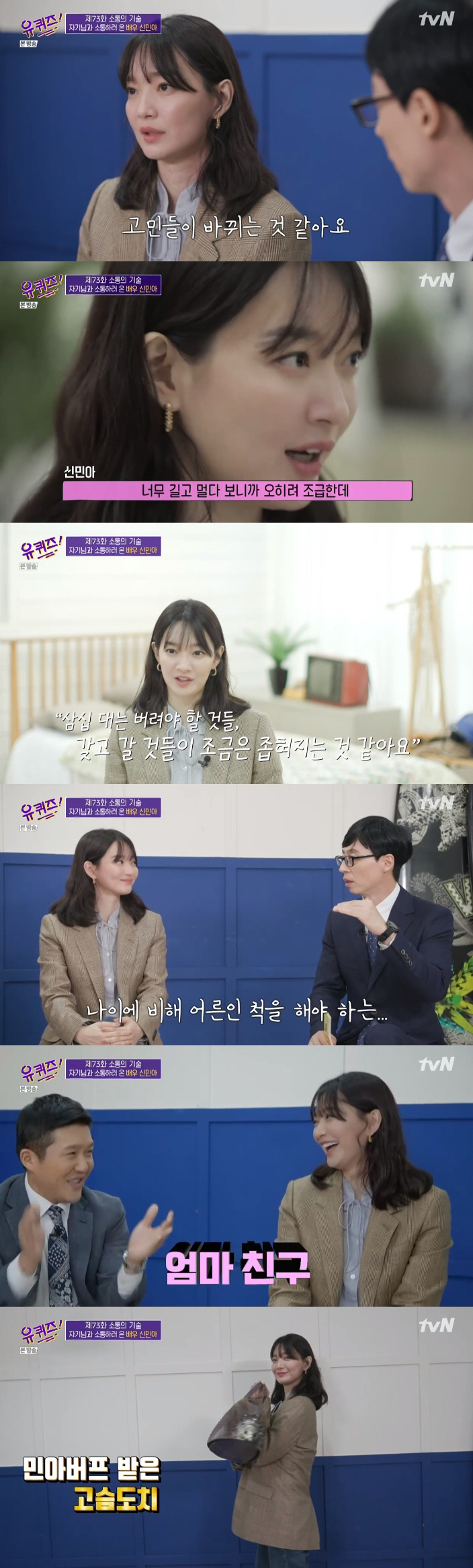 1998년에 15세의 나이로 잡지 모델로 데뷔해 연예계에 입문한 신민아는 "나이대에 따라 고민들이 바뀌는 거 같다"고 밝혔다. 그는 "10~20대 때는 방점 같은 뭔가 찍고 넘어가야 한다는 압박이 있었다. 어떤 방향의 길들이 너무 길고 멀다 보니까 오히려 조급한데 30대 때는 버려야 할 것들과 갖고 갈 것들이 조금은 길이 좁혀지는 거 같다. 욕심을 조금 내려놓다 보니까 마음의 여유가 생기고 모든 게 감사하다"고 말했다.