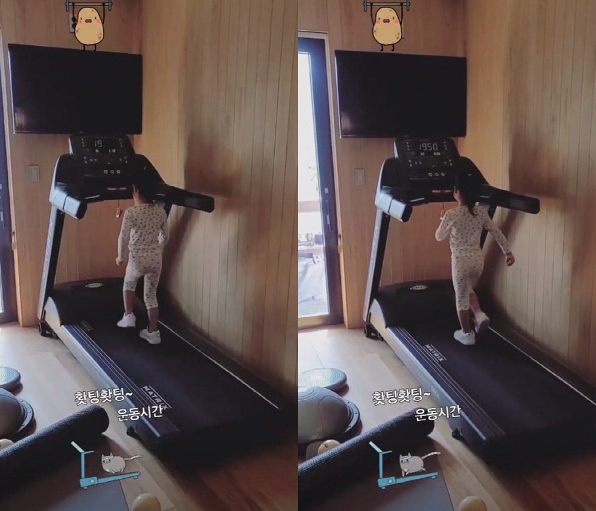 소유진은 이어 인스타그램 스토리를 통해 운동 중인 딸의 모습도 공개했다. 서현 양은 방 안에 딸린 러닝머신 위에 올라가 아장아장 걷고 있는 모습. 서현 양의 귀여운 뒷모습이 눈길을 모은다.