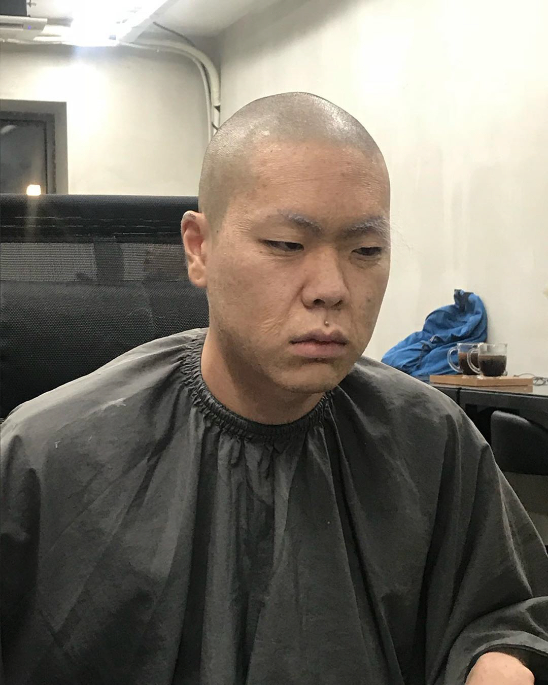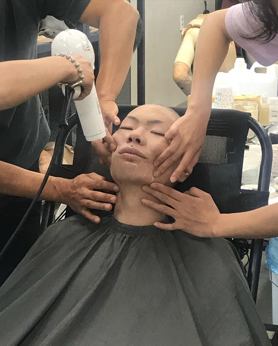 사진 속 오혁은 주름 가득한 노인의 모습이다. 오혁은 손가락으로 '브이'자를 그리며 자신의 변신이 만족스러운지 활짝 웃고 있다. 이와 함께 노인으로 변해가는 분장 과정이 담긴 사진도 눈길을 끈다.