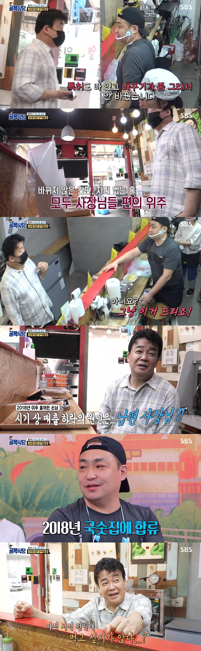 초반부터 불안했던 잔치 국숫집은 요리 자부심이 남다른 사장님의 태도와 달리 맛은 평범 그 자체로 포문을 열었다. 사장님은 본인 국수에 대해 99점이라는 높은 점수를 매기며 음식에 대한 자신감을 드러냈지만 백종원은 "잔치국수와 덮밥 모두 가격 대비 맛, 비주얼이 모두 평범하다"고 평가했다. 그는 "맛은 둘째고 개성을 만들어야 한다. 맛을 찾기보다 이 집만의 개성을 찾는 쪽으로 고민해 봐야 할 거 같다"고 솔루션을 제안했다.