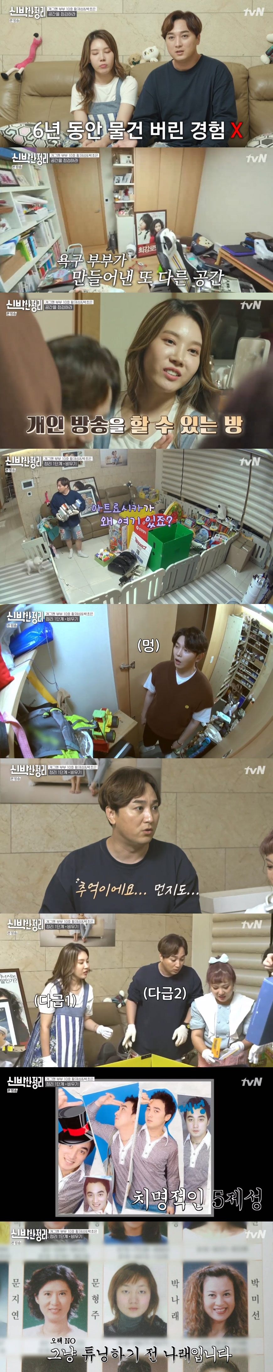 욕구 부부에게 찾아온 첫 비움의 시간. 황제성은 먼저 가득한 연애시절 아내와 함께 산 RC카에 "먼지도 추억이다"고 해 웃음을 안겼다. 그때 황제성의 과거 모습이 담긴 추억의 사진을 발견, 특히 10년 전 방송인 노조 수첩에서 튜닝 전 박나래과 신애라의 모습이 공개돼 웃음을 안겼다. 이후 신박한 정리단이 떠난 후 부부는 스스로 비움의 시간을 가졌다. 아내는 "아들이 꿈꿀 수 있는, 육아하기에 최적화된 집이 됐으면 좋겠고, 신랑이 일하고 왔을 때 푹 수 있는 공간이 생겼으면 좋겠다"고 했다.