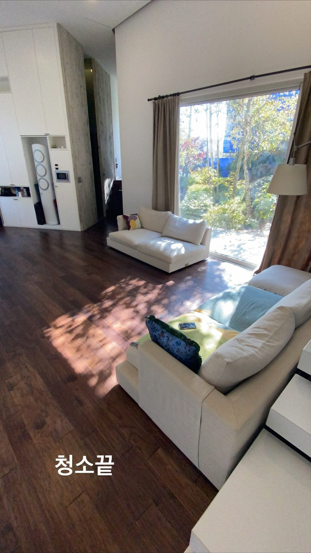 윤혜진은 20일 자신의 인스타그램 스토리를 통해 "청소 끝"이라는 글과 함께 한 장의 사진을 게재했다. 공개된 사진 속에는 엄태웅 윤혜진 부부의 집이 담겼다. 숲 같은 정원이 한 눈에 보이는 통유리창의 거실은 햇빛이 그대로 들어와 아늑한 느낌을 준다.