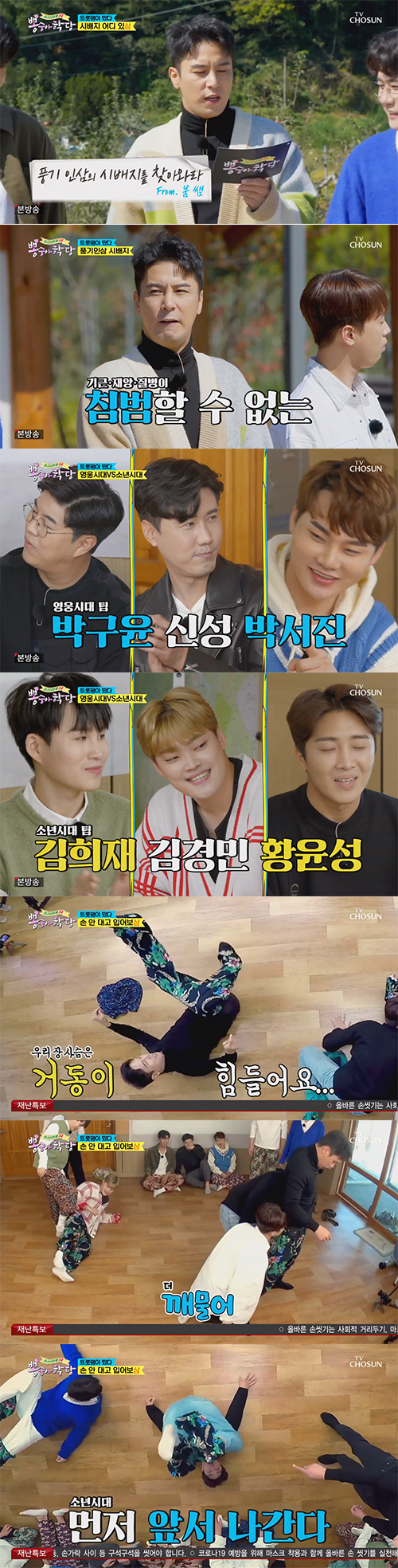 이날 트롯 패밀리는 임영웅과 이찬원 팀장을 중심으로 영웅시대 팀은 박구윤, 신성, 박서진, 영탁이 소년시대 팀은 김희재, 김경민, 황윤성, 장민호으로 나뉘어 일손 도울 장소를 정하는 '손 안 대고 일 바지 입기 게임'에 돌입했다.
