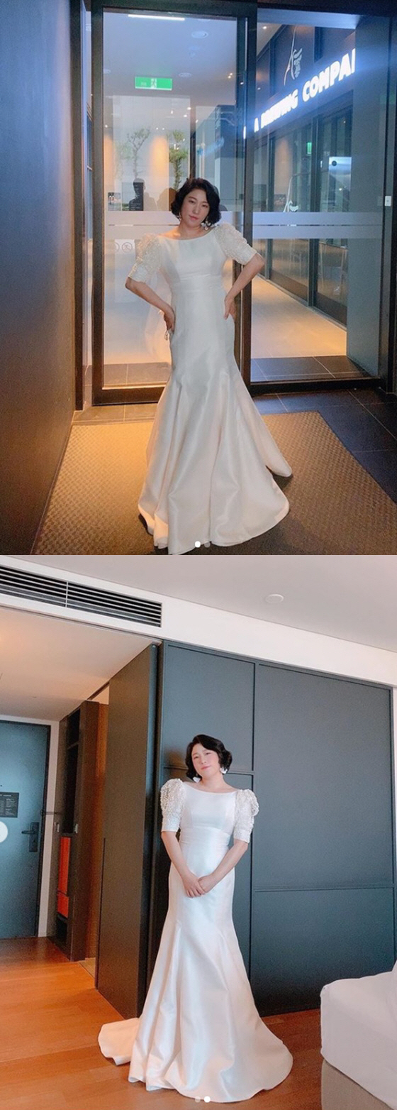 이날 김영희는 제29회 '부일영화상' 시상자로 참석했다. 타이트한 화이트 드레스를 입은 김영희는 예비신부 답게 드레스를 완벽하게 소화하며 우아한 미모를 자랑해 시선을 모았다.
