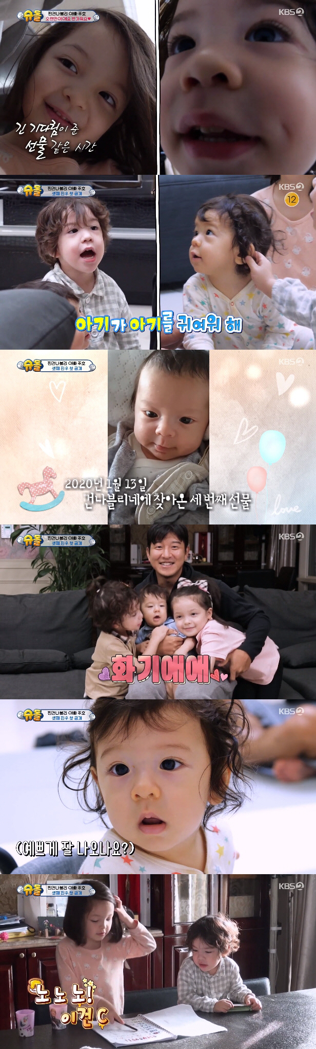 나은이와 건후의 소리에 셋째 진우가 잠에서 깼다. 지난 1월 13일 태어난 진우는 누나 나은이의 눈과 형 건후의 코, 입을 쏙 빼닮은 사랑스러운 외모로 랜선 이모, 삼촌들을 심쿵하게 했다.