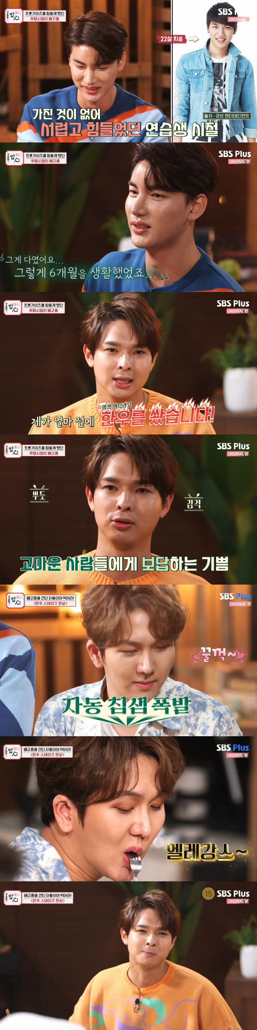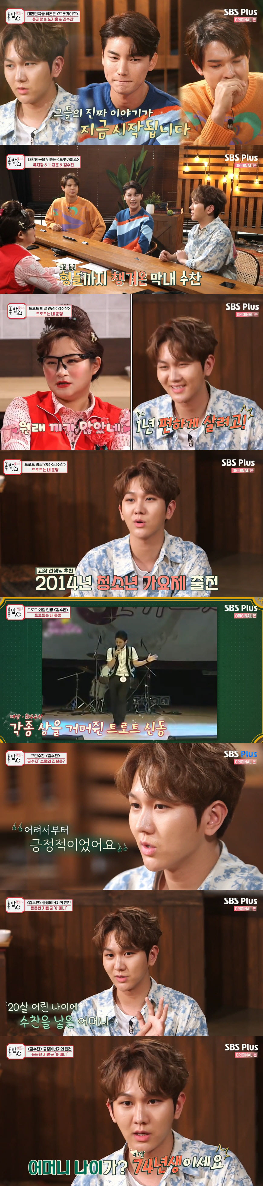 세 사람은 배고팠던 시절을 언급했다. 김수찬은 "고1 때 1년 동안 편하게 지내기 위해 담임선생님 결혼식에서 축가를 불렀다. 그 일을 계기로 트로트 가수의 꿈을 키우게 됐다"고 털어놨다. 그는 "교장 선생님이 보시고, 교장 선생님 추천으로 청소년 가요제 나가서 대상 타고 전국 노래자랑에 나갔다"고 떠올렸다.