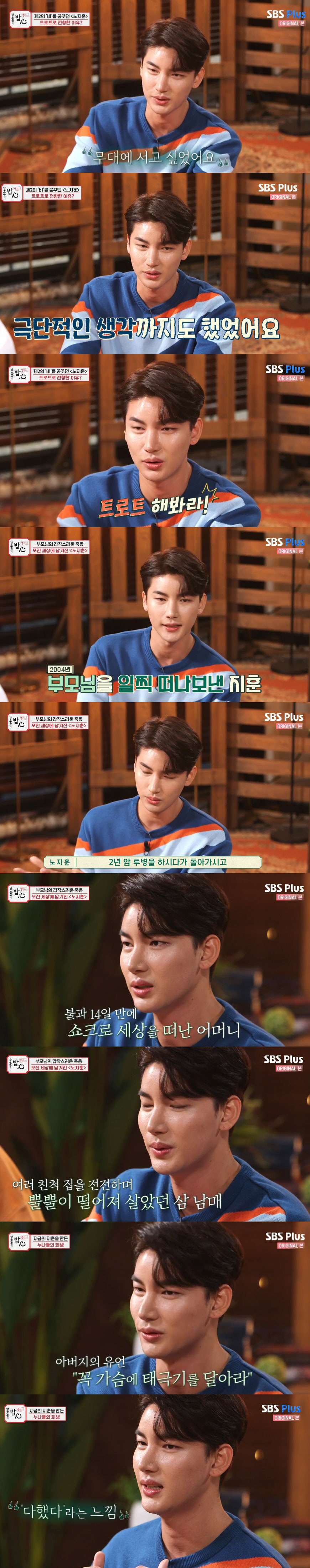 그는 "아버지의 유언이 '가슴에 태극기를 달아라'였다. 그래서 열심히 했다. 운동이 회비, 훈련비가 많이 든다. 누나들이 뒷바라지 해줬는데 염치가 없더라"며 "그래서 더 열심히 했서 청소년 국가대표까지 발탁이 됐는데 중학교 3학년 때 무릎에 큰 부상을 당했다. 십자인대 100% 파열이었다. 이후 수술과 재활을 반복하다 보니 '다했다'는 느낌이 왔다"고 털어놨다. 노지훈은 "가수의 꿈을 중학교 3학년때부터 꿨다. 다친 이후로 위로를 해주고 받은 게 음악이었다"고 덧붙였다.