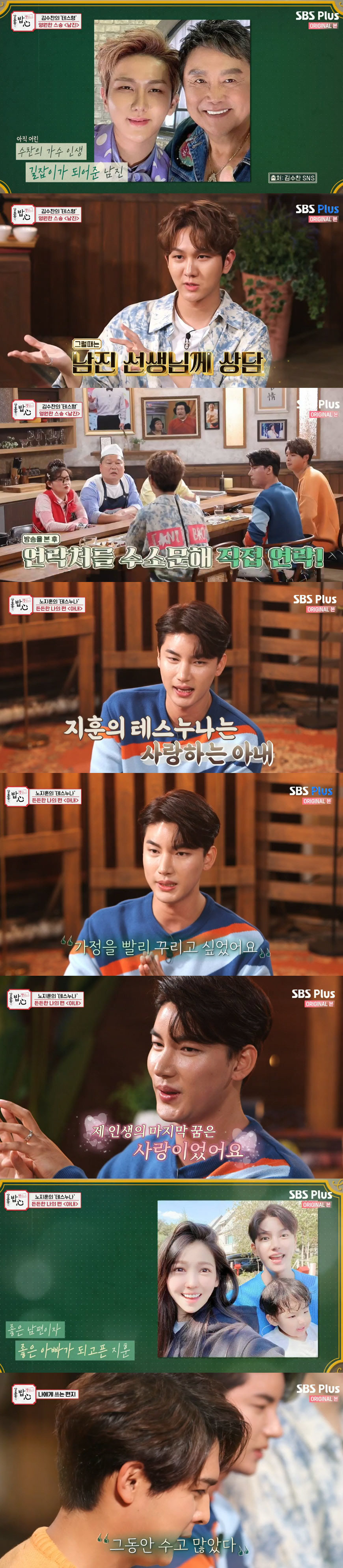 노지훈은 스승으로 아내를 꼽았다. 그는 일찍 결혼한 이유에 대해 "부모님이 일찍 돌아가신 게 영향이 컸다. 가정을 꾸리고 싶었다. 인생의 꿈은 사랑이었다"고 했다. 노지훈은 "아내를 통해서 많은 것 들을 도전하고, 많은 걸 극복하고 많은 걸 이겨나갈 수 있는 힘을 갖게 됐다"며 아내를 향한 애정을 드러냈다.