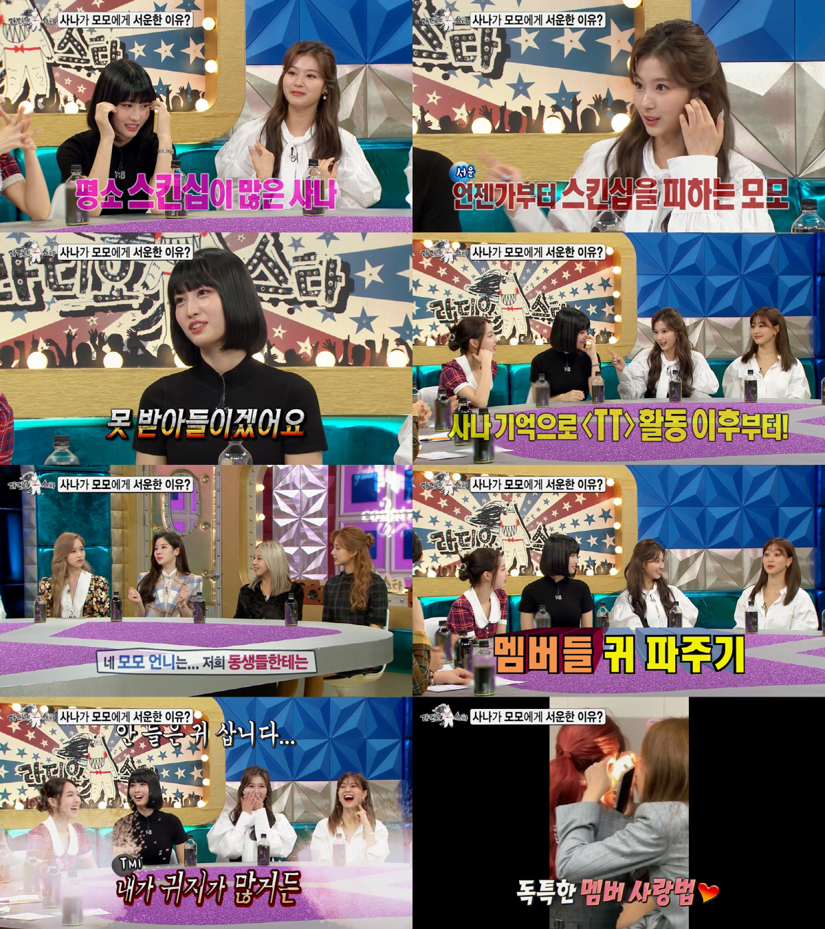 그러자 모모는 "동생들한테 스킨십을 정말 많이 한다. 그런데 동갑과 언니한테는 못 받아들이겠어요"라고 해명(?)했다. 특히 "다현이는 볼도 만지고 싶고, 채영이는 그냥 만져도 반응이 웃기다면서 쯔위한테는 잘 안 해요"라고 덧붙여 웃음을 유발했다.