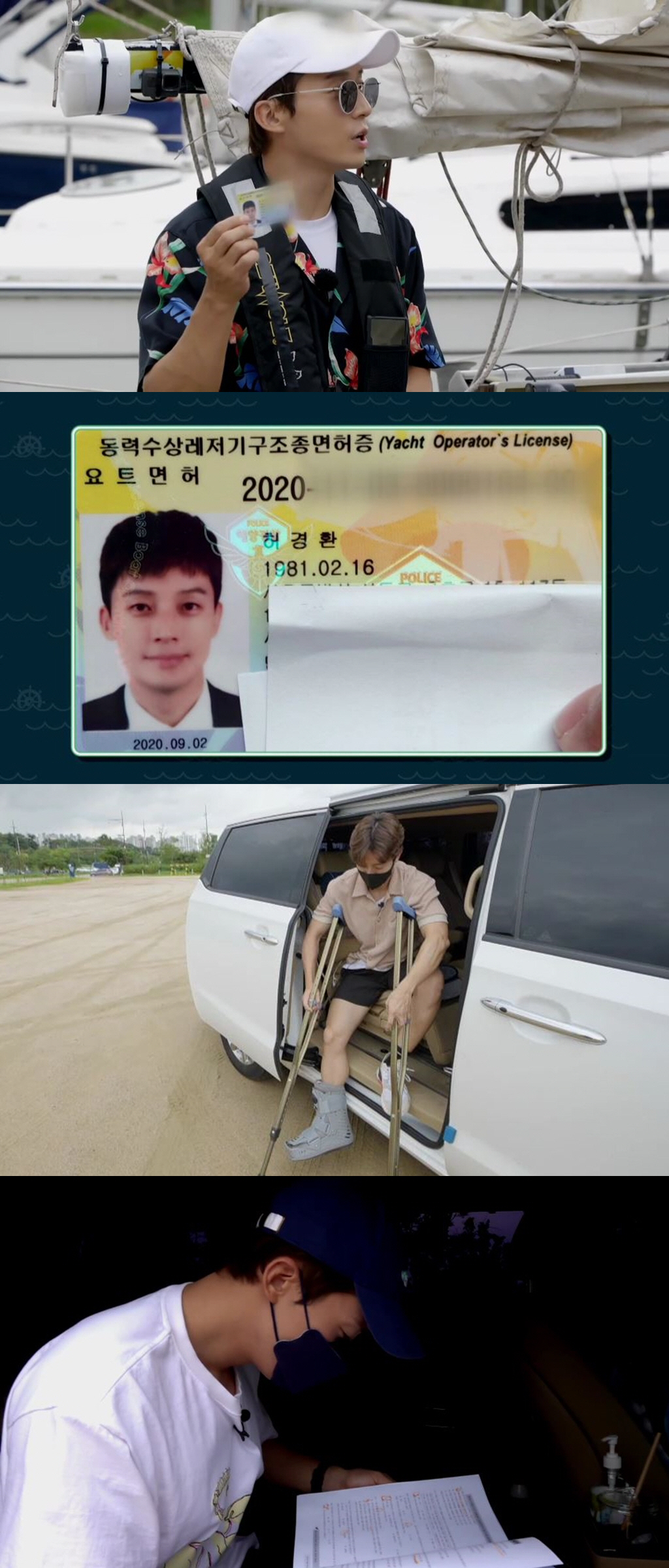 공개된 사진에는 허경환의 눈물 어린(?) 요트 면허 취득 과정이 담겨 있어 눈길을 끈다. 목발 투혼까지 펼치며 시험장에 나타난 허경환은 막판 벼락치기 중인 듯한 모습이다. 충격의 3연속 불합격 통보를 받고 좌절한 그의 모습은 벌써부터 웃음을 예고한다. 어렵게 딴 영광의 요트 면허증도 공개됐다. 샤방샤방 미소를 짓고 있는 허경환의 증명사진이 포착돼 시선을 강탈한다.