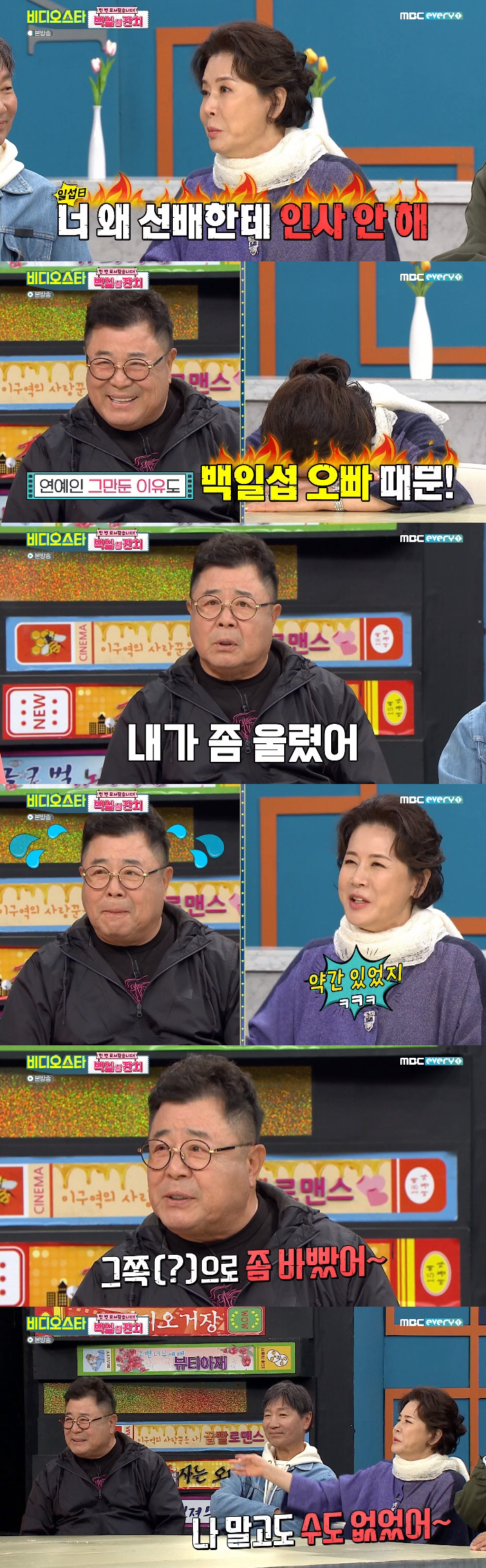 이날 박정수는 백일섭의 첫인상에 대해 "정말 날 괴롭힌 남자"라고 말했다. 그는 "내가 지금은 라식을 해서 좀 보이는데 과거에는 시력이 마이너스9였다. 얼마나 안 보였겠냐. 그래서 안경 끼기 전에는 사람만 보이면 무조건 인사를 했다"며 "근데 내가 어쩌다가 그냥 가면 '너 왜 선배한테 인사 안 하냐'면서 시비를 걸었다. 그래서 무조건 인사했는데 그러면 '왜 또 인사를 하냐'고 했다"고 폭로했다.