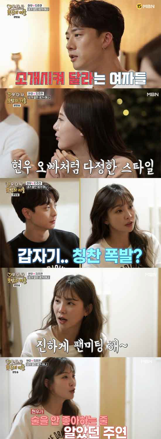 지인은 "형이 주량은 적은데 술 먹는 자리는 좋아한다. 주량이 한잔은 아니다. 현우 형이 집에 술을 숨겨놓는 게 취미다"라고 폭로했다. 자리를 비웠던 현우가 돌아오자 지주연은 "종잡을 수 없는 스타일 같다. 겉으로 보여지는건 너무 스윗하고 다정다감한데 진짜 현우의 마음을 모르겠다. 이 사람의 진짜의 모습을 알려면 더 신중하게 봐야한다 그런 느낌"이라고 의심했다. 현우는 "벽을 치는게 좀 있어. 난 최대한 친근하게 다가가려고 하는데 어떤 사람은 그 친근함을 자연스럽게 받아들이는데 주연이는 한번씩 바라보는 느낌을 받는다. 그럼 서운하다"라고 솔직하게 말했다.