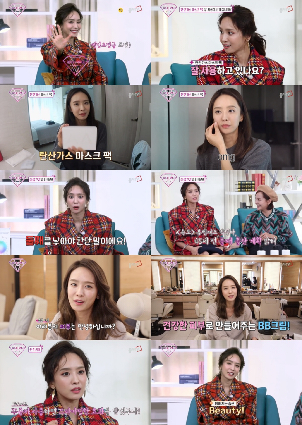 어제(21일) 방송된 동아TV '뷰티 앤 부티 시즌5'에서 박정아가 유진, 치타, 솔빈, 박기량, 김유미와 함께 탄산가스 마스크팩, BB크림 리뷰와 함께 뷰티 팁을 전수했다.