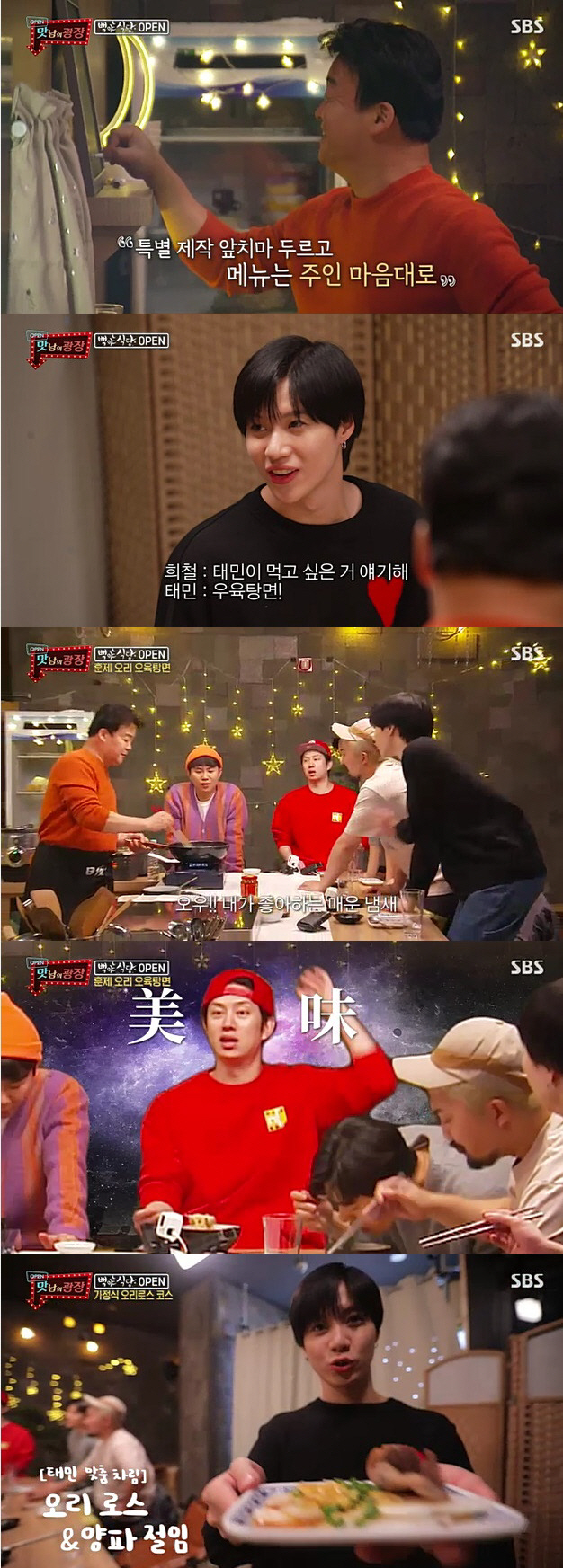 백종원은 모든 재료를 계량 없이 즉흥적으로 넣으며 뚝딱뚝딱 요리를 완성했다. 소고기 대신 오리고기를 넣은 우육면을 맛본 태민은 "대만에서 먹는 것보다 맛있다"며 감탄했다. 다른 멤버들 역시 '찐리액션'을 보이며 '오육탕면'을 극찬했다.