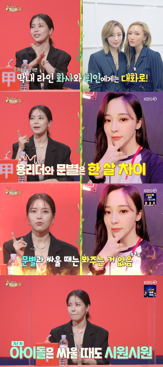 이에 솔라는 멤버들간의 갈등에 대해 "막내 라인인 화사, 휘인과는 치고받고 싸우진 않는다. 조심스럽게 얘기한다. 하지만 한살 차이나는 문별과는 봐주는것 없이 싸운다. 그러나 싸우고 나서는 곧바로 푸는 편이다"고 전했다.