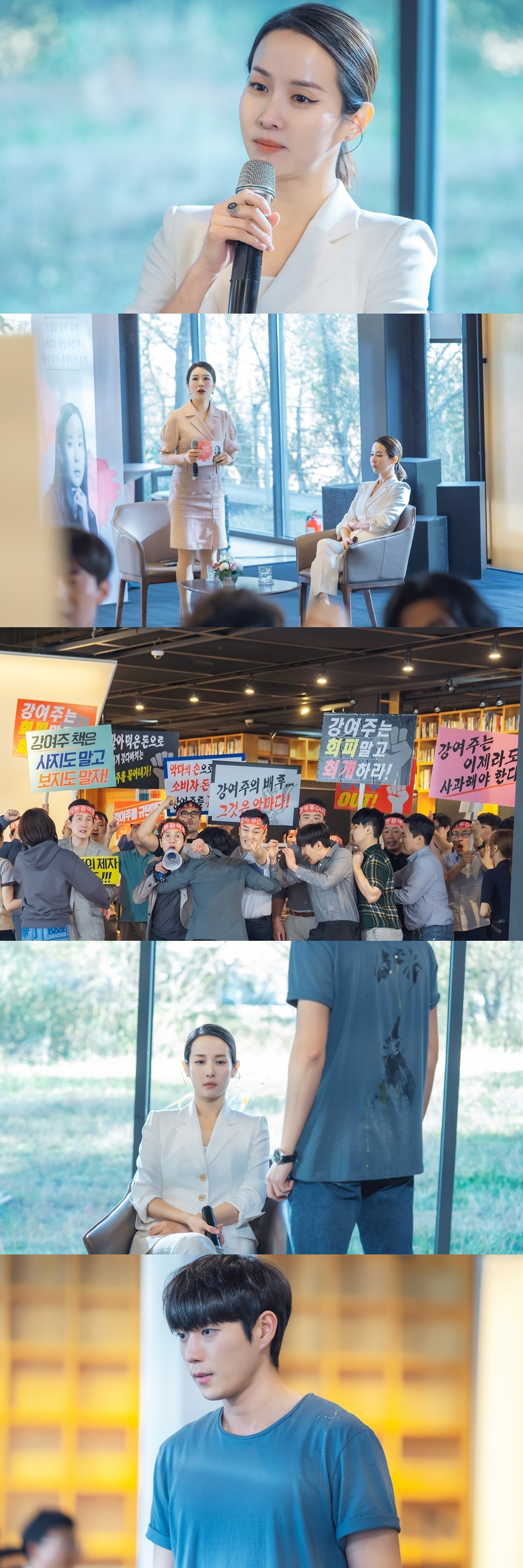 그러나 그런 여주의 기분을 망치는 사건이 발생한다. 시위대가 북토크 현장을 습격한 것. 시위대는 피켓을 들고 소란을 피운다. 달걀 투척까지 서슴지 않는 모습이 위기일발의 느낌을 준다.
