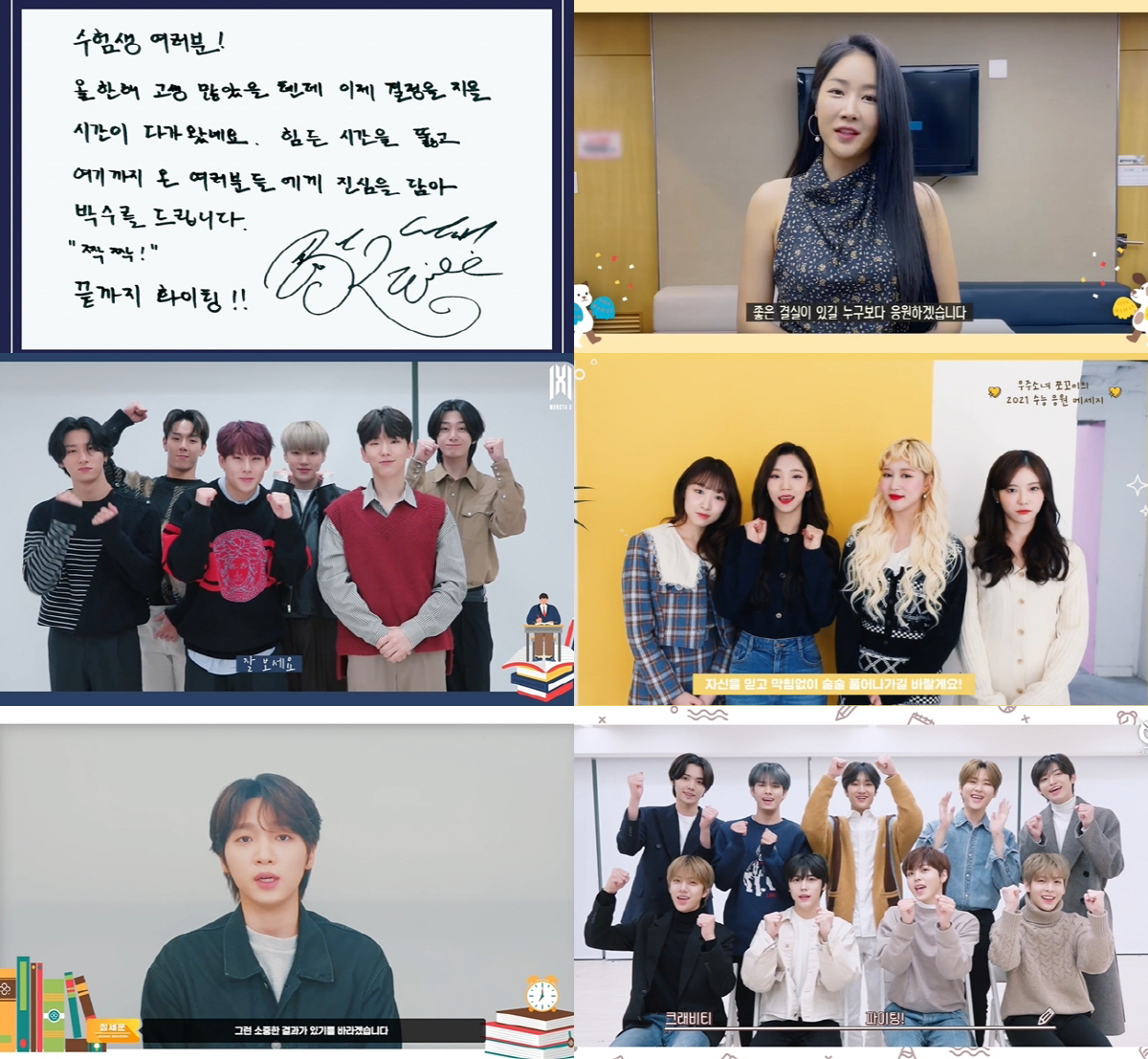 [스포츠조선닷컴 이지현 기자] 가수 케이윌, 소유, 몬스타엑스, 우주소녀 유닛 쪼꼬미, 정세운, 크래비티(CRAVITY)가 수험생들을 향해 응원의 메시지를 전했다.