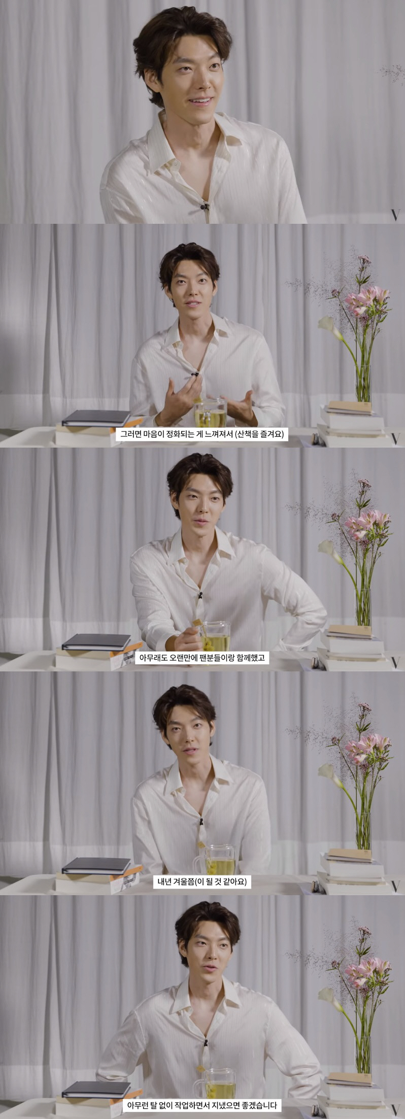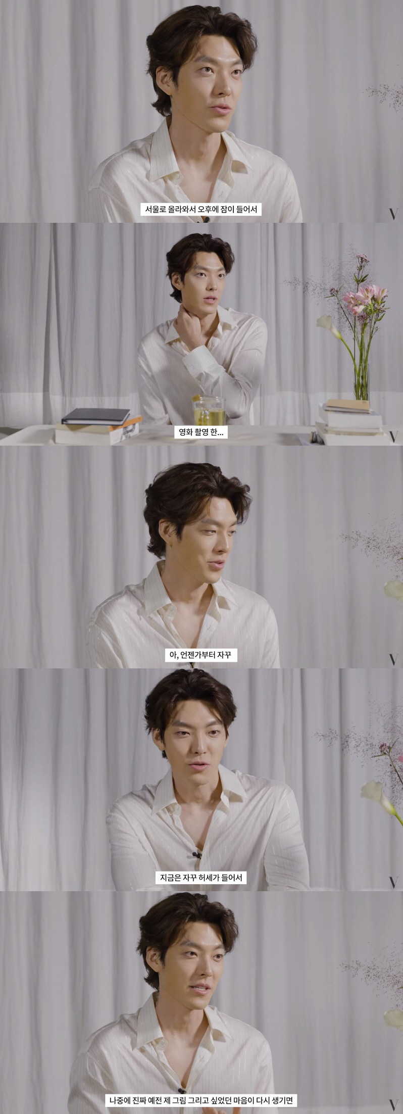 취미가 그림이라고 밝혀온 김우빈은 "언젠가부터 멋지게 그리려 한다. 예전엔 그리는 행위 자체가 좋았는데 지금은 자꾸 허세가 든다"며 달라진 모습을 밝혔다. 새로 생긴 취미는 산책이라며 "30대가 돼서 그런가 자연 보는 걸 좋아하게 됐다. 가까운 공원 같은 곳을 찾아 걷는 걸 좋아한다. 나무도 보고 하늘도 보면 마음이 정화되는 느낌"이라며 웃었다.