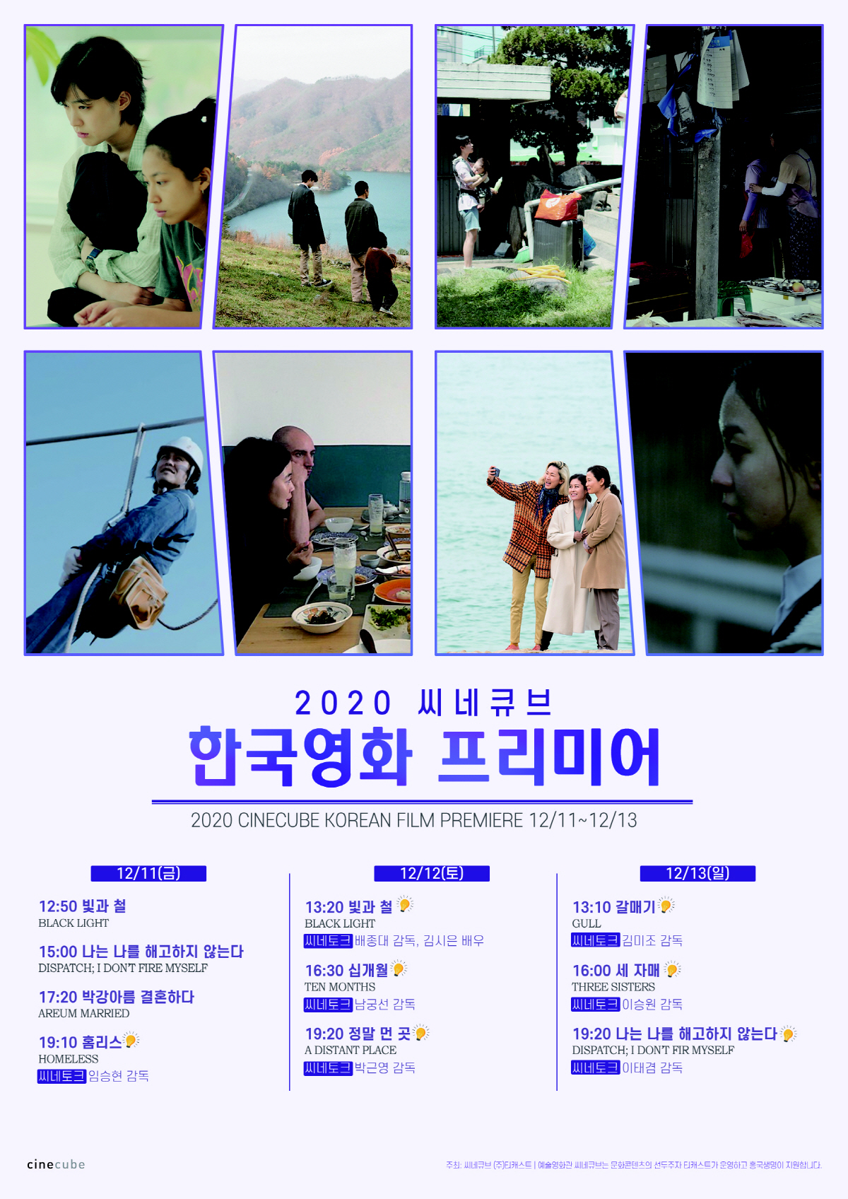 '2020 씨네큐브 한국영화 프리미어 특별전'을 찾는 관객들을 위해 특별한 시간도 준비했다. 영화를 연출한 감독 및 출연한 배우들의 설명을 통해 작품을 보다 더 즐겁게 즐길 수 있는 씨네토크를 진행한다. 12/11(금) '홈리스', 12/12(토) '빛과 철', '십개월', '정말 먼 곳', 12/13(일) '갈매기', '세 자매'는 영화 관람 후 씨네토크를 함께 관람할 수 있다. 상영작은 씨네큐브 홈페이지 또는 모바일앱에서 예매 가능하다.