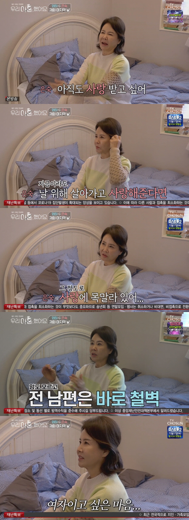 [스포츠조선 조윤선 기자] '우이혼' 선우은숙이 전 남편 이영하 앞에서 아직도 여자이고 싶은 마음이 있다고 고백했다.
