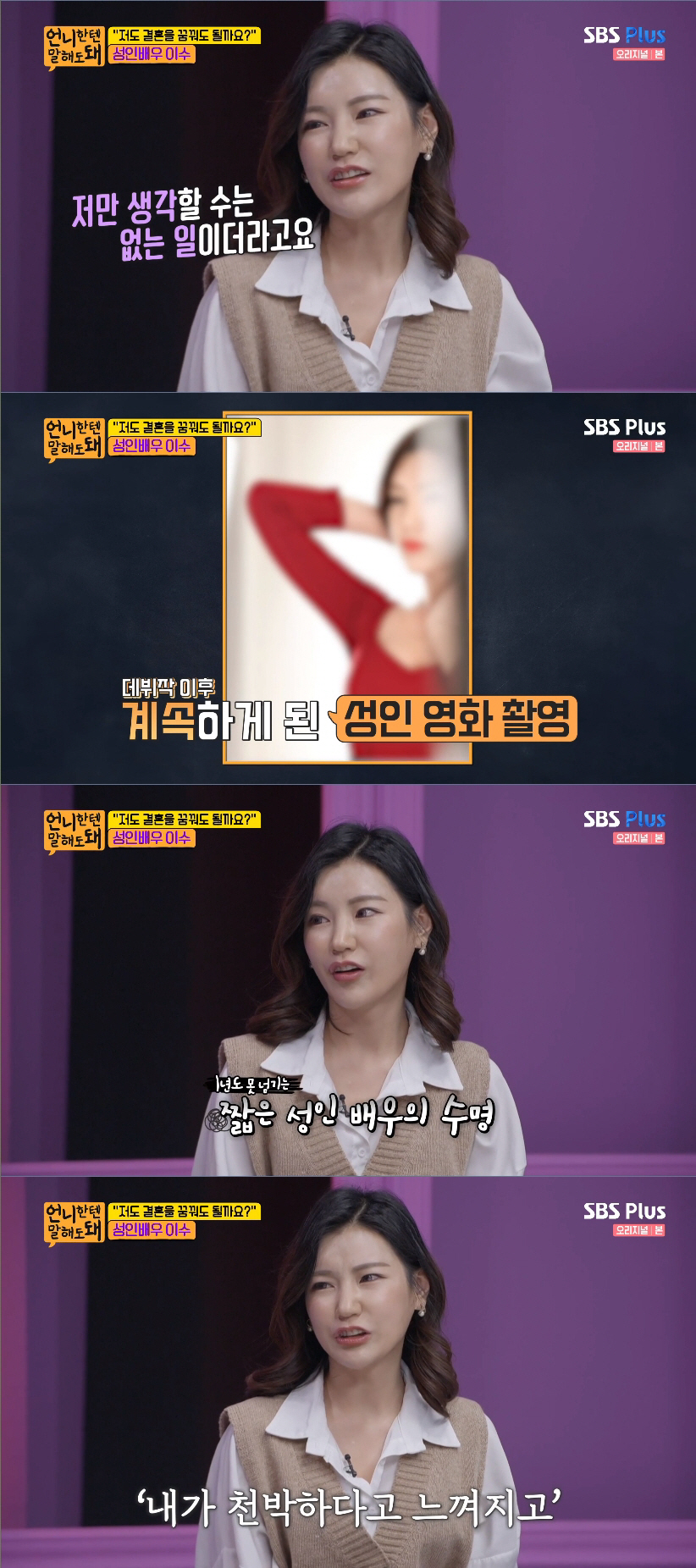 [스포츠조선닷컴 김수현기자] 성인배우 이수가 자신의 직업에 대한 자부심이 있음에도 전남자친구에 대한 트라우마로 인해 결혼에 대해 고민했다.
