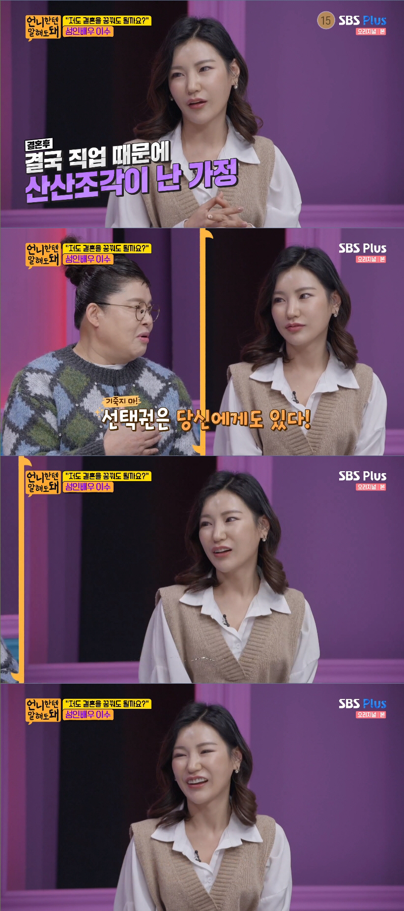 언니들의 조언을 모두 들은 이수는 감동한 듯 "방송에 정말 잘나왔다 싶다. 당당해지고 싶어서 나온 거였는데, 이런 자리가 있어서 너무 감사드린다"라고 소감을 밝혔다.