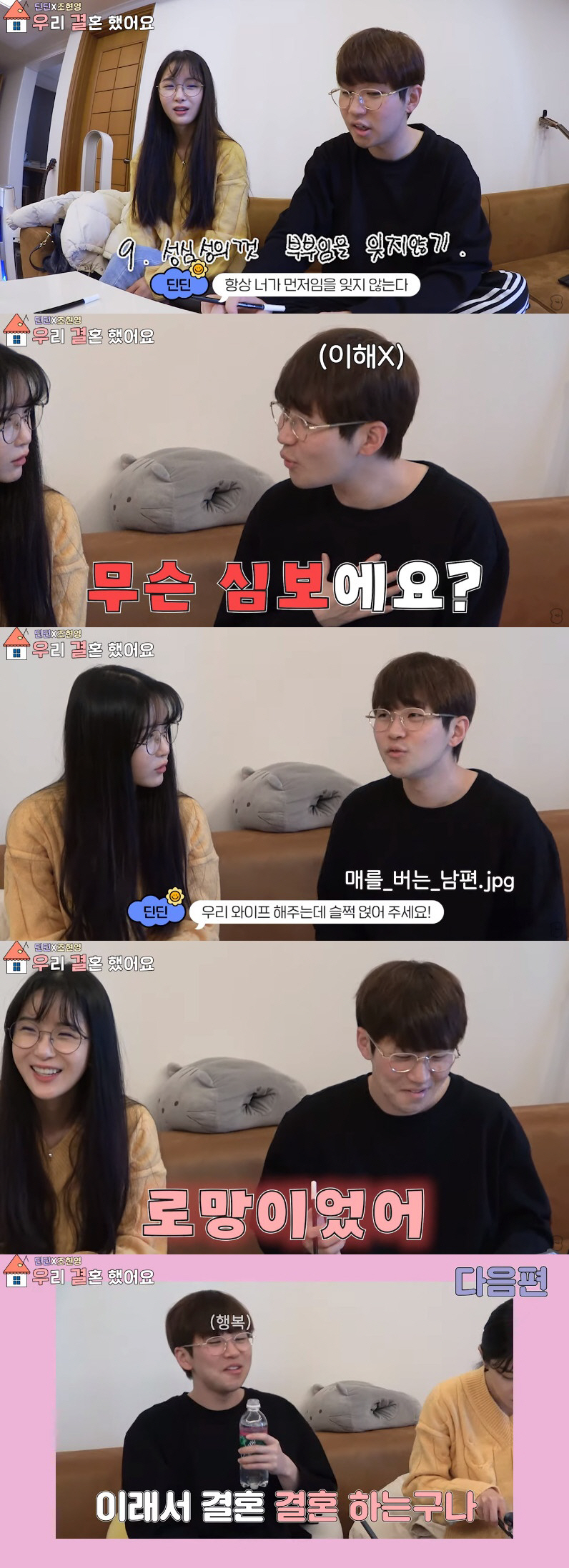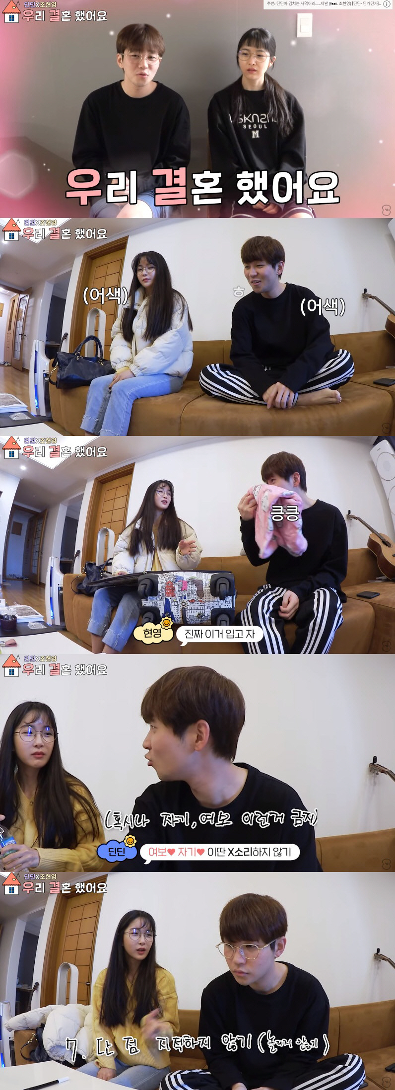 또 딘딘이 한시에 야식과 술을 마실 계획을 세우자 조현영은 "나 술 못 마신다"고 말했고, 딘딘은 "이렇게 하나도 안 맞는데 결혼을 했지?"라고 말했다.