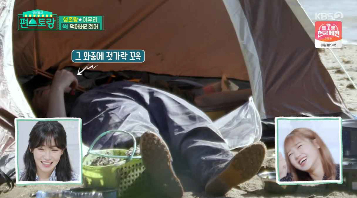 텐트로 돌아온 이유리는 우유각을 냄비 삼아 쏙 굴면을 끓였다. 책과는 달리 타는 우유각에 당황한 이유리는 결국 미리 준비한 냄비를 꺼내 남은 라면을 완성했다. 간이 싱겁자 쏙 젖갈을 넣어 라면을 완성한 이유리는 "멍게 맛이 나는 시원한 맛"이라고 설명했다.