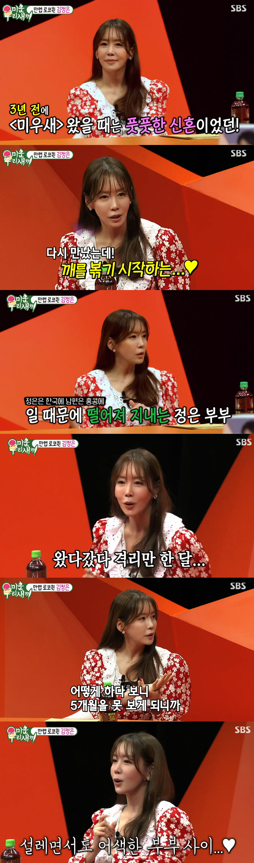 3년 전 '미우새' 출연 당시 신혼이었던 김정은은 어느새 결혼 5년 차로 접어들었다며 "옛날엔 3~4일 쉬게 되면 홍콩에 가서 주말을 보내고 남편을 만나는 게 가능했지만 지금은 (코로나19 때문에) 격리를 해야 한다. 격리만 한 달이 걸린다. 그러다보니 5개월을 못 보다 최근 다시 만났다. 다시 만나니까 깨를 볶기 시작했다"고 웃었다.