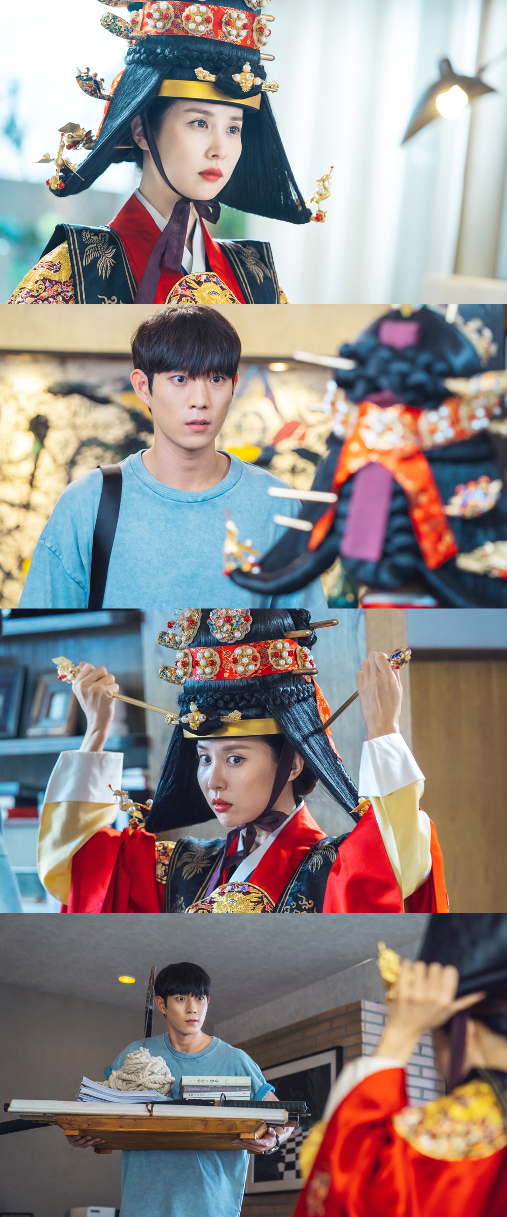 공개된 사진엔 가채까지 완벽하게 갖춘 대례복 패션을 한 여주의 모습이 담겼다. 여주는 진짜 '중전마마'가 된 듯 기품이 넘치는 아우라를 뿜어내고 있다. 그런 여주를 맞닥뜨린 수호는 말문이 막힌 듯 동공지진을 일으킨 모습이다. 금세라도 웃음이 터져 나올 것 같지만, 웃지 않으려 정신력으로 버티는 느낌이 폭소를 자아낸다.