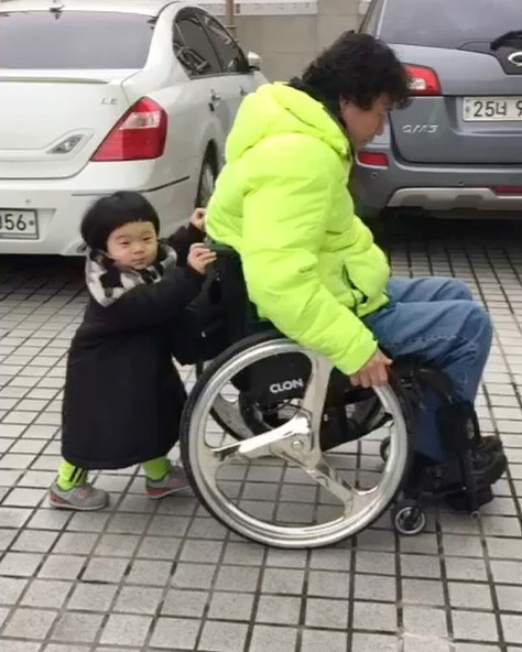 영상에는 김송과 강원래의 아들인 강선 군이 아빠의 휠체어를 밀고 있는 모습이 담겼다. 기저귀를 차고 아장아장 걸으면서도 아빠를 돕겠다고 나서는 선이의 모습이 뭉클하다.