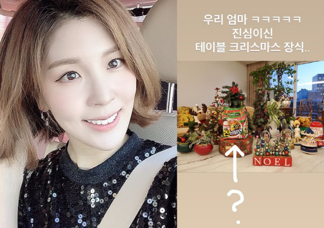 함연지는 10일 자신의 인스타그램 스토리를 통해 "우리 엄마 ㅋㅋㅋㅋ진심이신 테이블 크리스마스 장식"이라는 글과 함께 한 장의 사진을 게재했다. 공개된 사진 속에는 함연지 집에 꾸며진 크리스마스 장식이 담겼다. 스노우볼부터 미니 트리, 인형 등 예쁜 크리스마스 장식품들이 가득한 가운데 함연지의 어머니는 색이 비슷한 비빔라면을 올려놔 웃음을 안겼다. 함연지 가족의 라면 사랑과 애사심이 돋보인다.