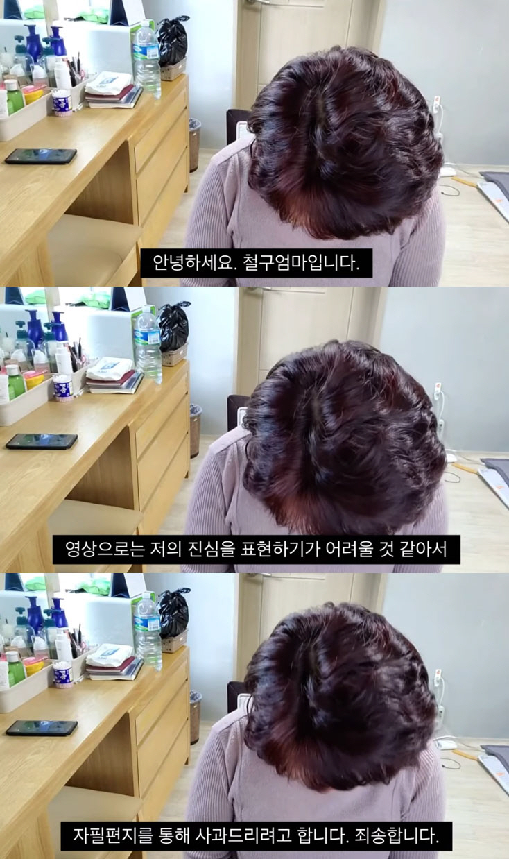 철구 모친은 "제 아들의 경솔한 발언을 '실수'라고 표현한 것과 '욕하는 분들은 지금껏 실수한 적 없는지 지인들에게 물어보는 기회를 가졌으면 좋겠다'라는 등의 표현을 한 것에 대해 진심으로 사과드린다"고 사과했다.