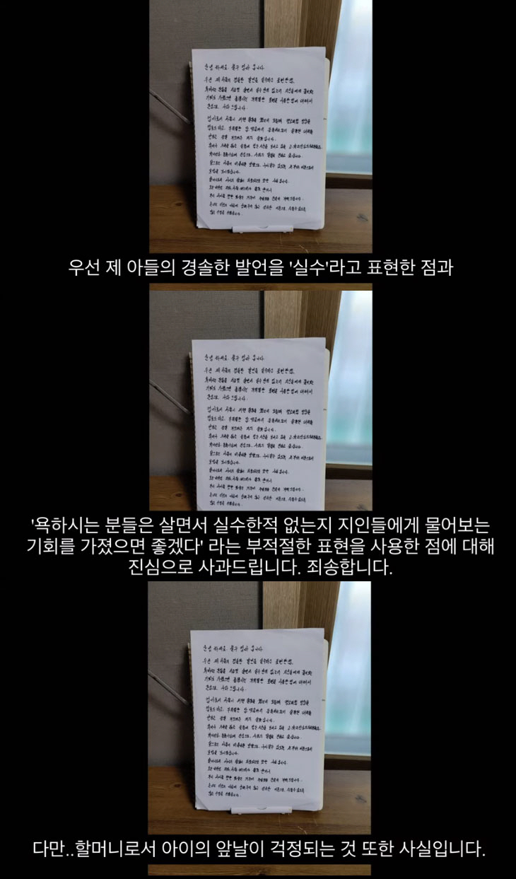 이어 자막을 통해 "영상으로는 저의 진심을 표현하기가 어려울 것 같아서, 자필편지로 사과 드리려고 한다"며 사과문을 공개했다.